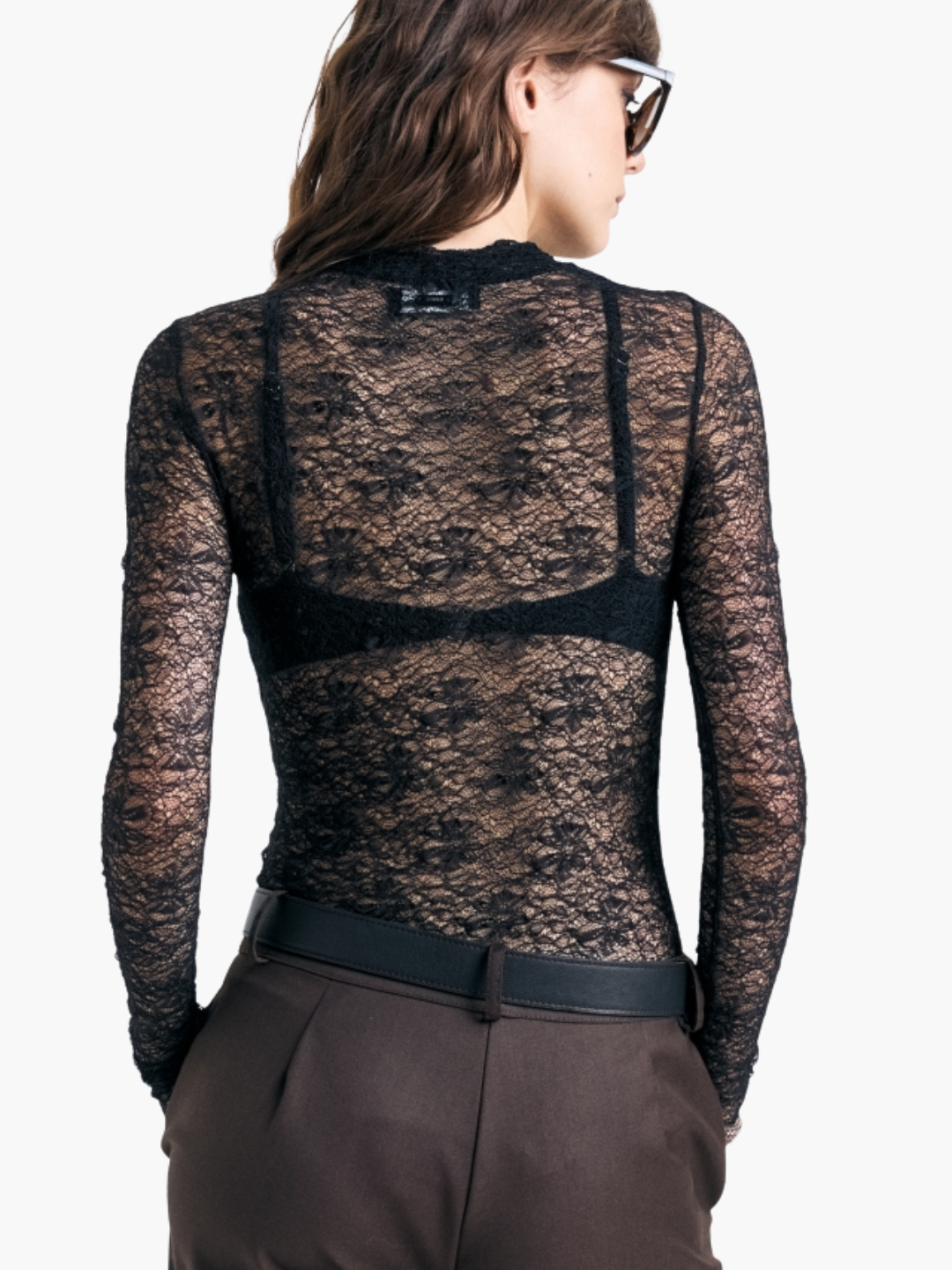 Body de encaje manga larga con cuello media polera. Avíos personalizados.Composición: 92% Nylon 8% Spandex