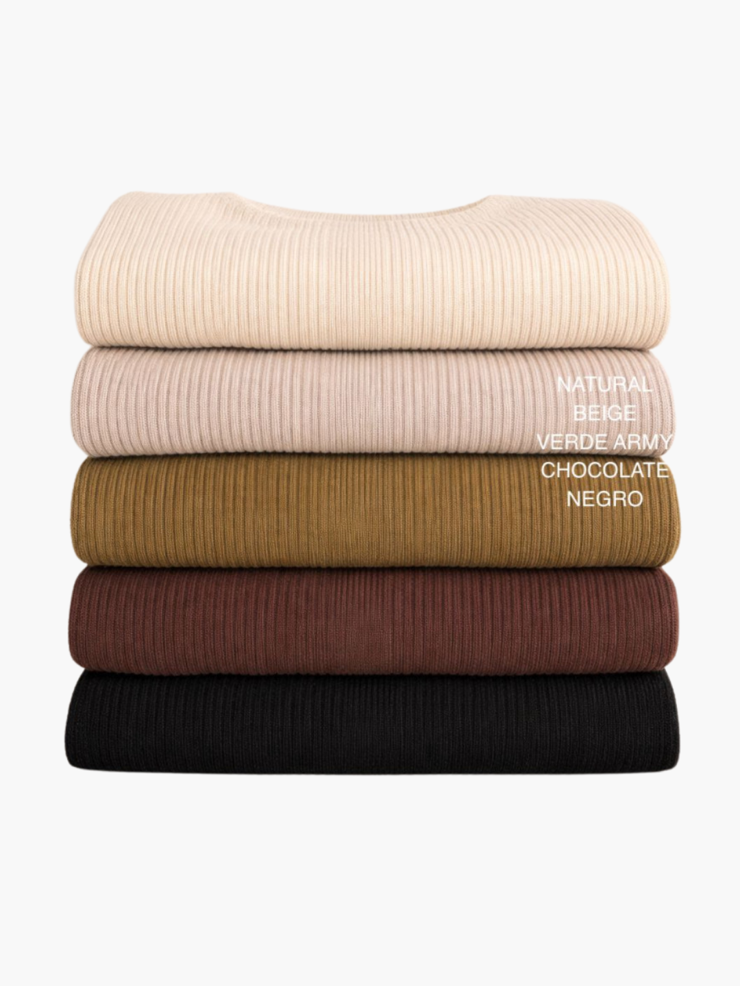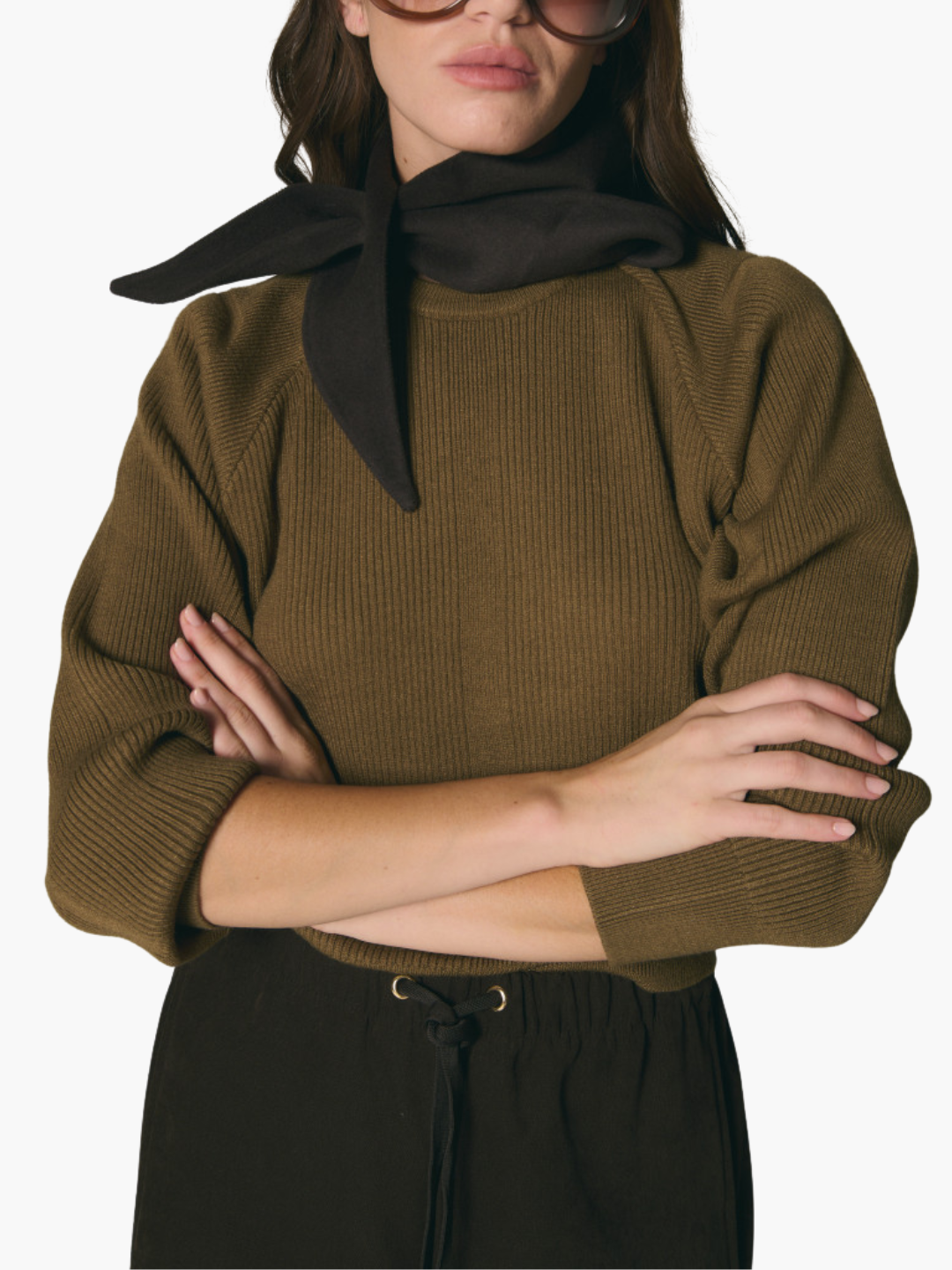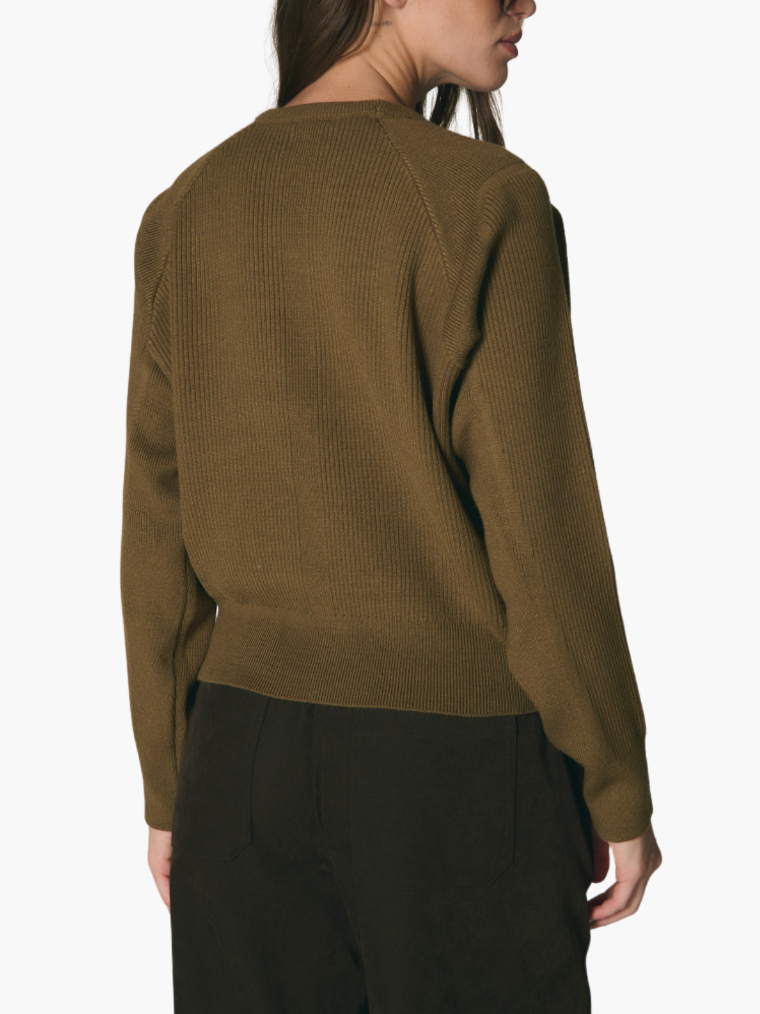 Sweater de cuello redondo confeccionado en hilado Manhattan. Presenta mangas ranglan tejidas en punto perlée, que aportan textura y un detalle distintivo al diseño. De calce cómodo, ideal para un look clásico y moderno a la vez.
