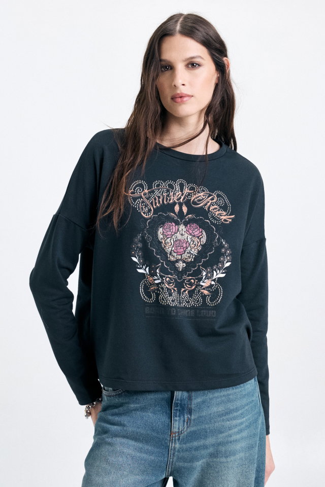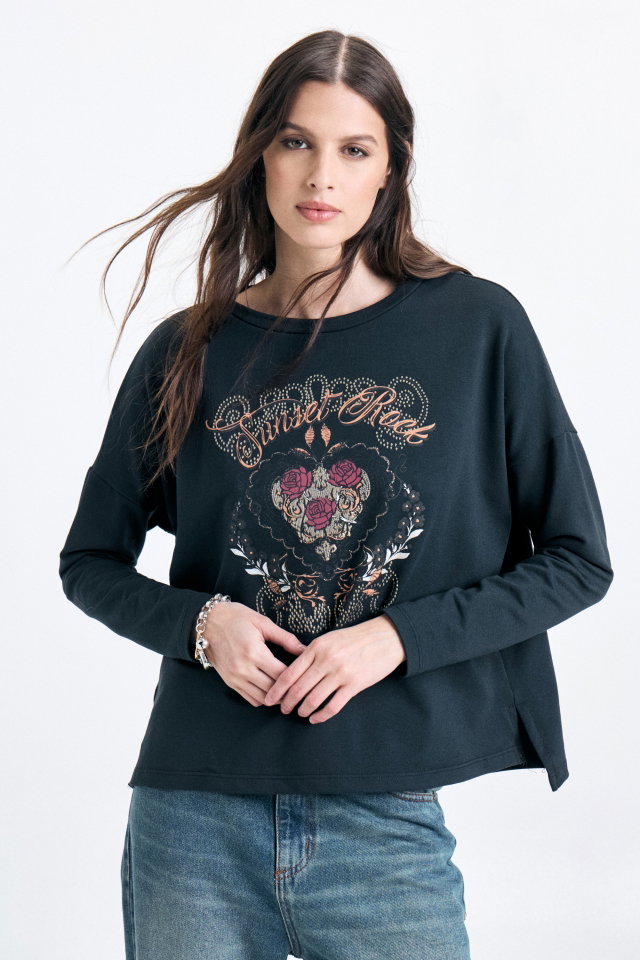 Buzo de rústico con lycra, con cuello redondo y corte clásico. Lleva estampa central en el delantero. En la espalda superior lleva badana marcaria. Composición: Algodón 48% Poliéster 48% Elastano 4%