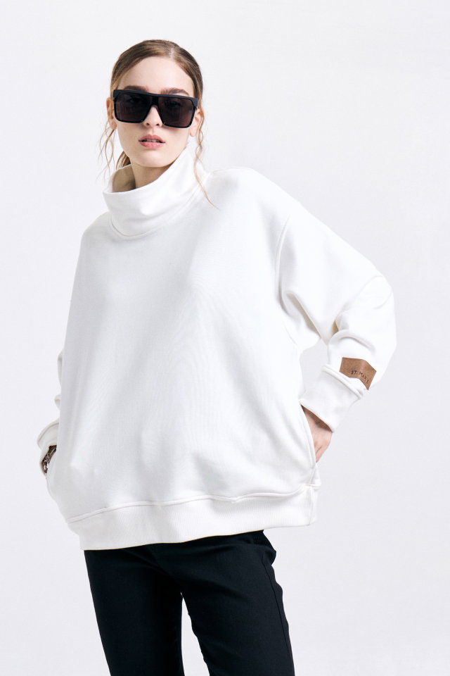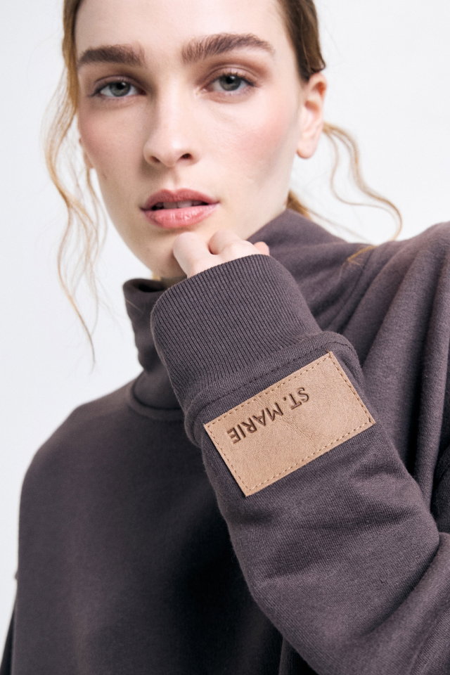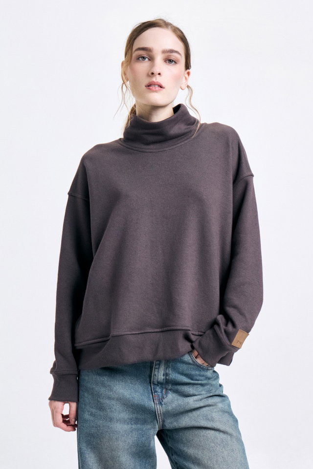 Maxibuzo con cuello tortuga, confeccionado en tela rústico con puños de manga y cintura en ribb al tono. En la manga izquierda lleva badana de marca. Composición: 80% algodón 20% poliéster